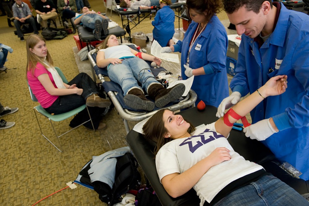 Alyssa Schreiner, center top, fourth-year public policy major, and Emily Schreiner, graduate student in secondary science education, take part in a blood drive sponsored by the American Red Cross. The Schreiner family acknowledges that blood donation saved the life of their baby sister, Rachel Schreiner, left, a second-year criminal justice major, who has had multiple heart surgeries due to a birth defect. -