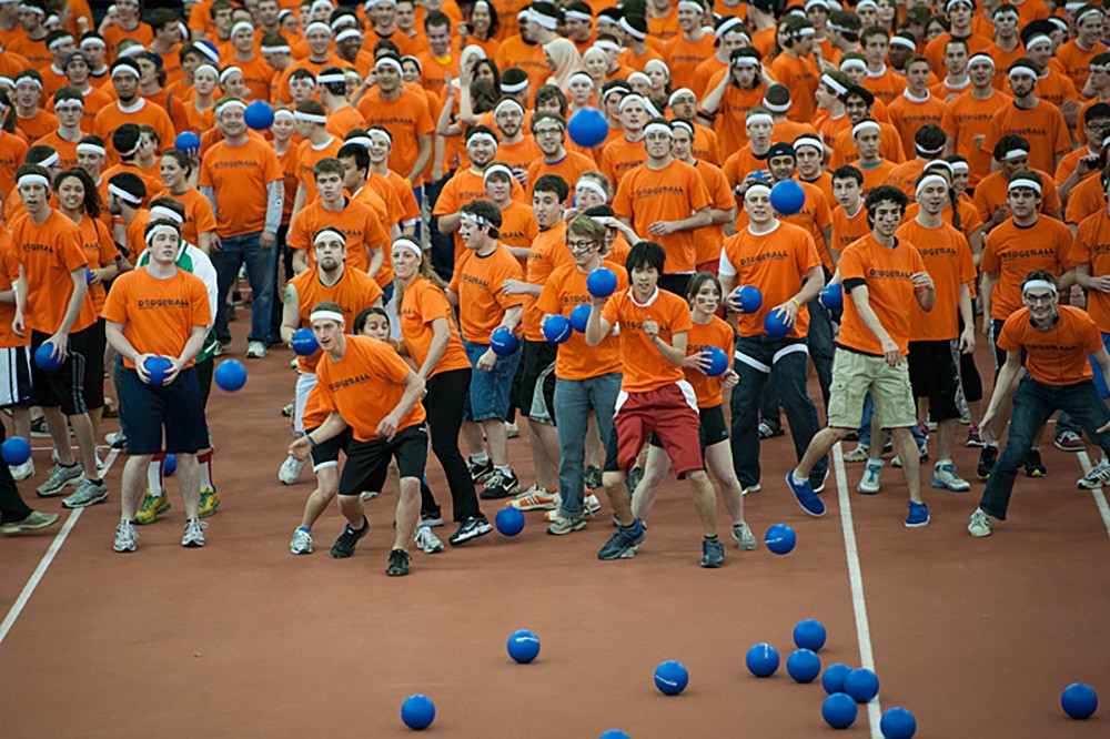 RITâs Phi Kappa Psi fraternity and the RIT Dodgeball Club broke the Guinness World Record for the largest single dodgeball game in history May 1 in the Gordon Field House and Activities Center. More than 2,100 members of the RIT community participated in the event, which broke the old record, held by the University of Alberta, of 2,012 players. -