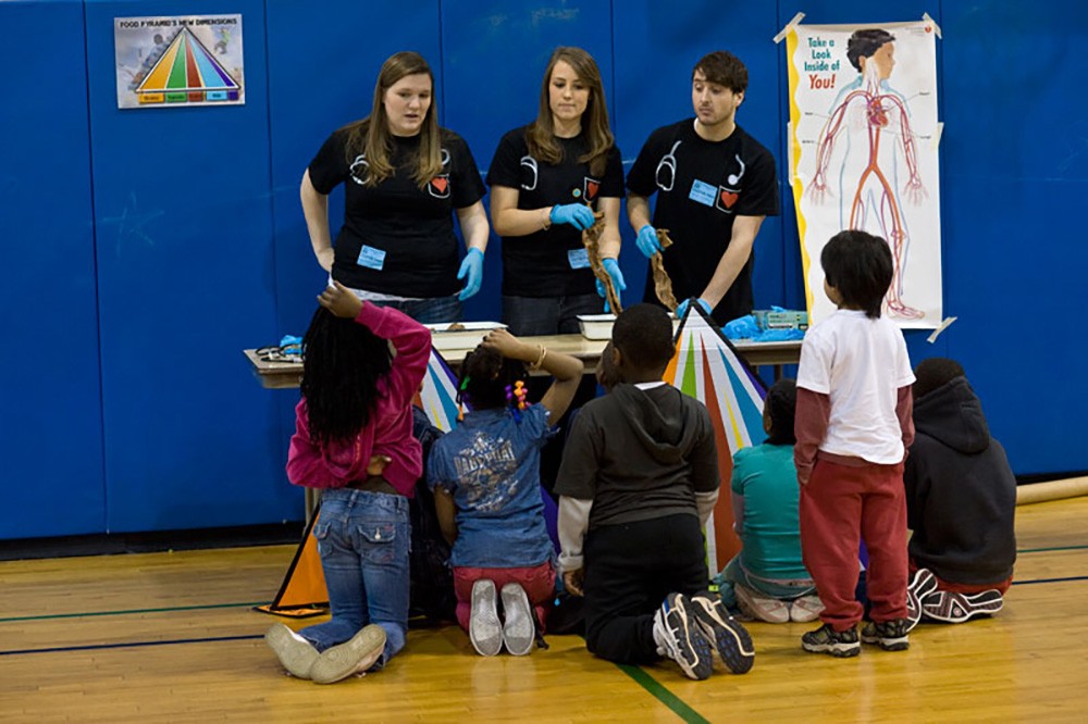 Students at James P.B. Duffy School No. 12 in Rochester learned a lesson in good health and wellness from RIT pre-med students. The RIT students have traveled to Rochester city schools throughout the year to teach the youngsters about good habits and healthy eating. -