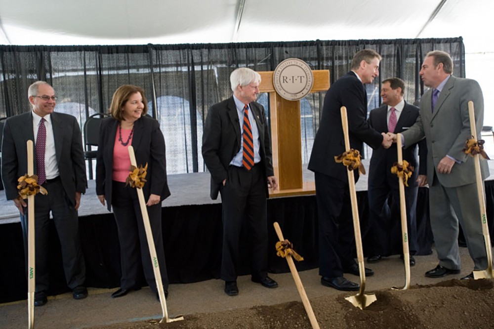 RIT President Bill Destler, center; Lt. Gov. Robert Duffy â93, center right; and Golisano Institute for Sustainability director Nabil Nasr, left, broke ground April 15 on a new facility for the Golisano Institute. They were joined by representatives from the National Institute of Standards and Technology and the state of New York. The facility was made possible through a $13.1 million grant from NIST and $10 million in funding from New York state. -