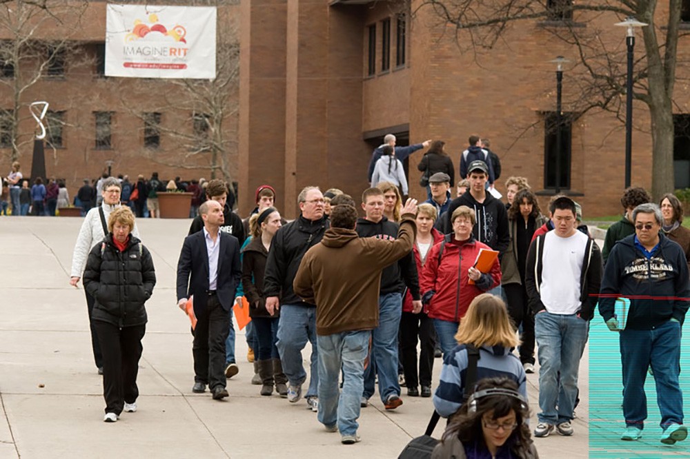 RIT students regularly give hour-long walking tours for prospective students, parents and other visitors to campus. The student perspective is important in addition to showing the academic, athletic and campus life facilities. -
