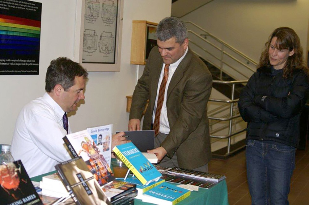 David Bainbridge, popular-science writer, veterinarian, reproductive biologist and Clinical Veterinary Anatomist from University of Cambridge, visited campus April 18 as part of the Caroline Werner Gannett Projectâs âVisionaries in Motion IVâ speaker series. Jamie Winebrake, dean of the College of Liberal Arts, and his wife, Susan, met Bainbridge during the book signing after the talk. -