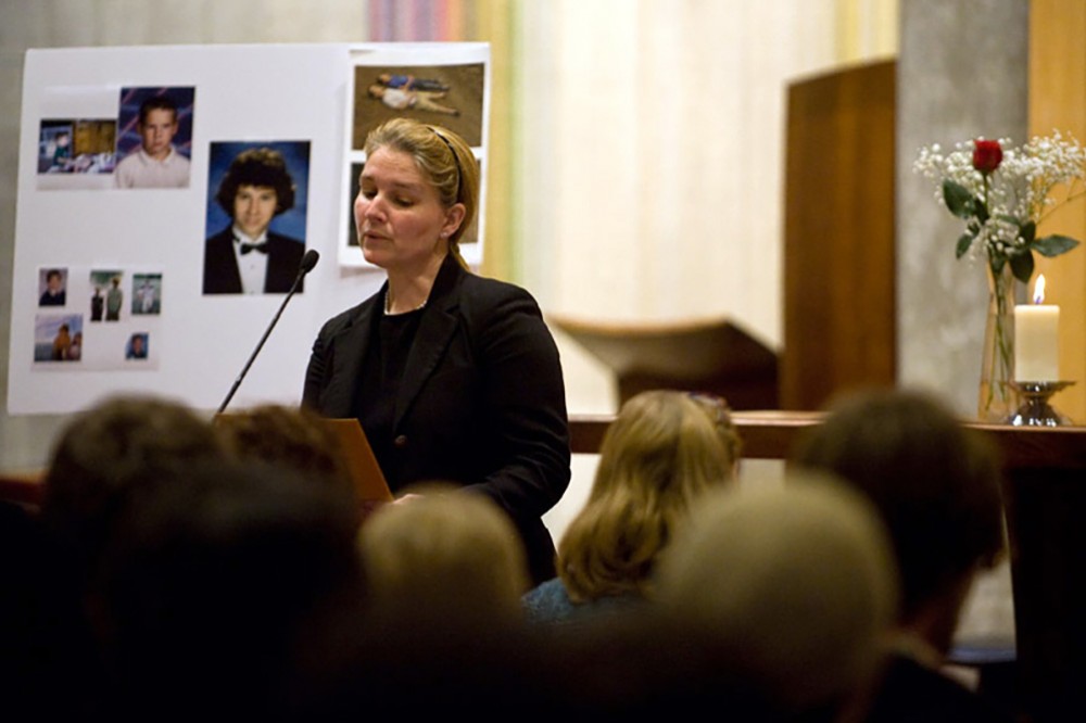 Paloma Capanna, an RIT adjunct professor in political science, helped lead the RIT community in its search for George Delany and spoke at a campus gathering April 19 in the Schmitt Interfaith Center. The third-year political science major went missing last month. His remains were found April 17 in a wooded area in Steuben County. -