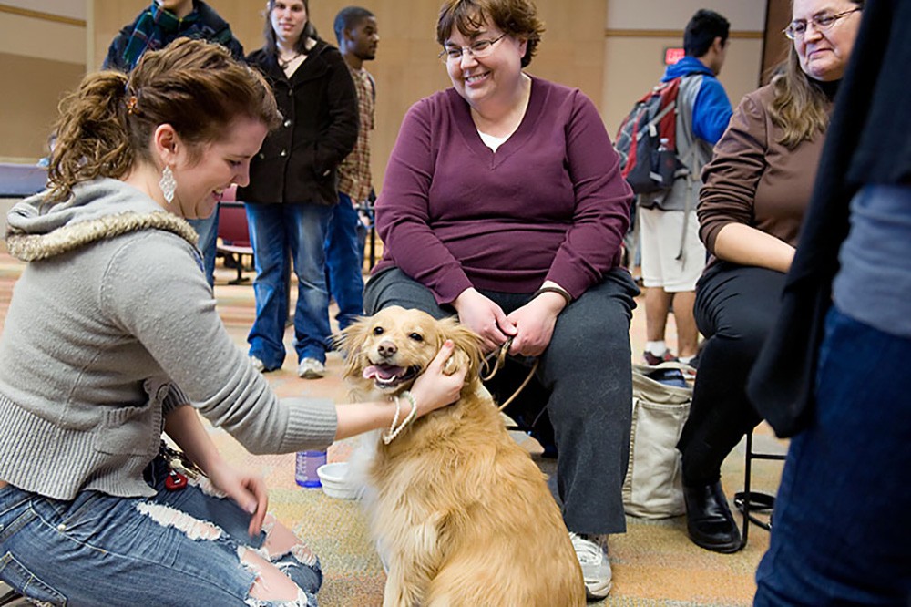 Therapy Dogs Internationalâhandlers with 10 certified therapy dogsâprovided a welcome break for RIT/NTID students as they entered exam week. Students âde-stressedâ with the dogs, who were wearing bandanas that read âPaws a While for Love.â