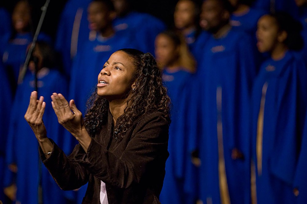 More than 130 full-time sign-language interpreters are found throughout RIT. Here, Angela Hauser interprets for the Aeolian Choir during RITâs Martin Luther King Day celebration. -