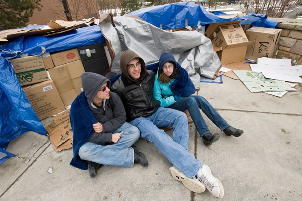 Shanty Town is a fundraiser and service event to benefit House of Mercy, a Rochester homeless shelter. Brothers of APO Xi Zeta lived in cardboard boxes by the Tiger statue March 7-11 to raise awareness about homelessness and hunger. From left, Chris Tarantino, Richard Latham and Alexa Seidner huddle under a blanket by the structure. -