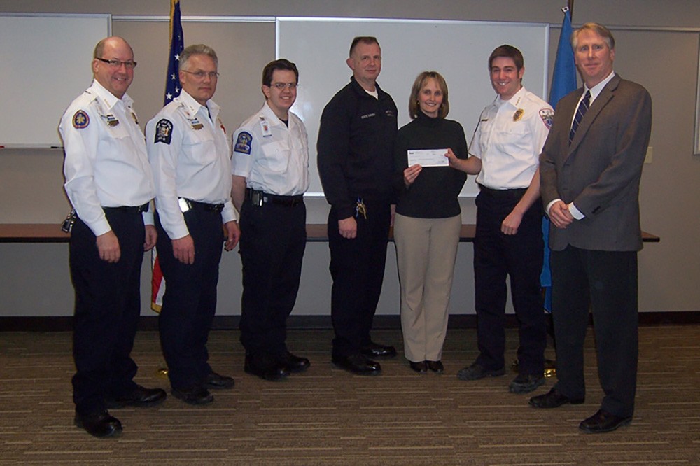 Ryan Buckley, chief of operations for RIT Ambulance, and Tim Keady, associate director of the Student Health Center, far right, led an RIT delegation on March 8 in presenting a voluntary $5,000 contribution on behalf of the university to Henrietta Ambulance. RIT Ambulance, which is a student-run Emergency Medical Services organization, works in close partnership with members of the townâs ambulance corps. Currently about a dozen RIT alumni volunteer with Henrietta Ambulance. -