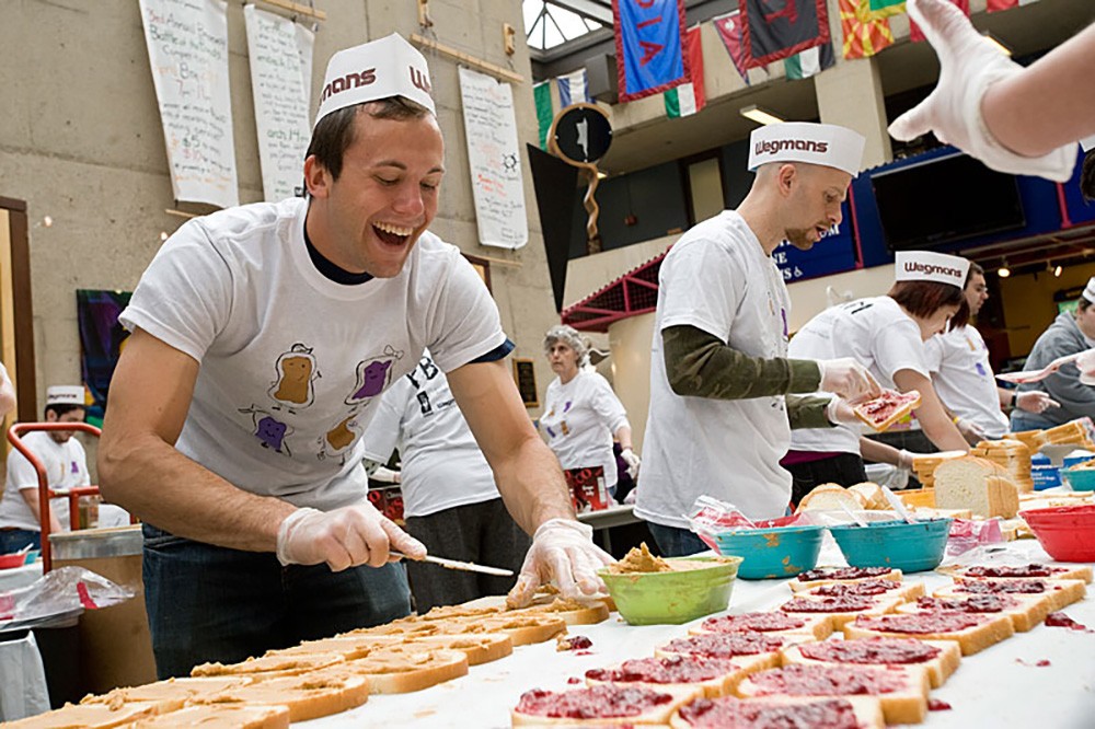 Students, faculty and staffâincluding Mark Leonardo, a third-year packaging science majorâparticipated March 14 in the popular PB Jam charity event, sponsored by RIT Hillel. Over 2,000 peanut butter and jelly sandwiches were assembled and delivered to five local shelters. -