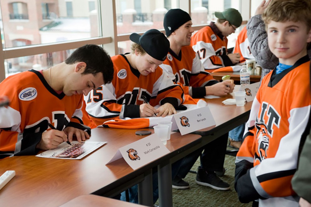 Barnes & Noble @ RIT hosted a meet and greet with the RIT menâs hockey team to benefit the Ronald McDonald House Charities of Rochester on Feb. 12. The event included a silent auction of RIT hockey memorabilia, donations for a team photo for the players to sign, giveaways and snacks. The total raised was $1,000. -