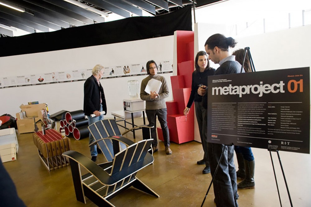 Design experts deliberated over chair prototypes designed by industrial design students as part of a juried competition Feb. 10 in collaboration with Wilsonart International. The students were required to use Wilsonart laminate in their chair designs. Jurors pictured from left to right are Wendell Castle, RIT artist-in-residence and furniture designer; Ron Labaco, senior curator at the Museum of Arts and Design; Grace Jeffers, project manager for the Wilsonart Challenge; and Allan Chochinov, editor-in-chief of Core 77. Jurors selected six student designs, including Dan Kestlerâs design (foreground) which conjoins two Adirondack chairs, to be featured at the International Contemporary Furniture Fair in New York City in May. -
