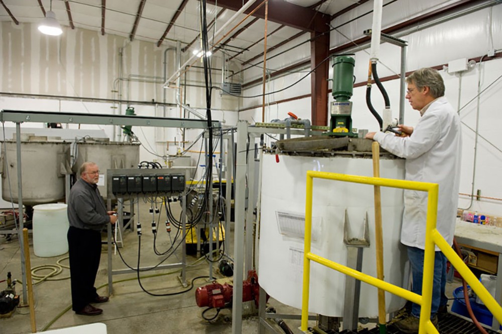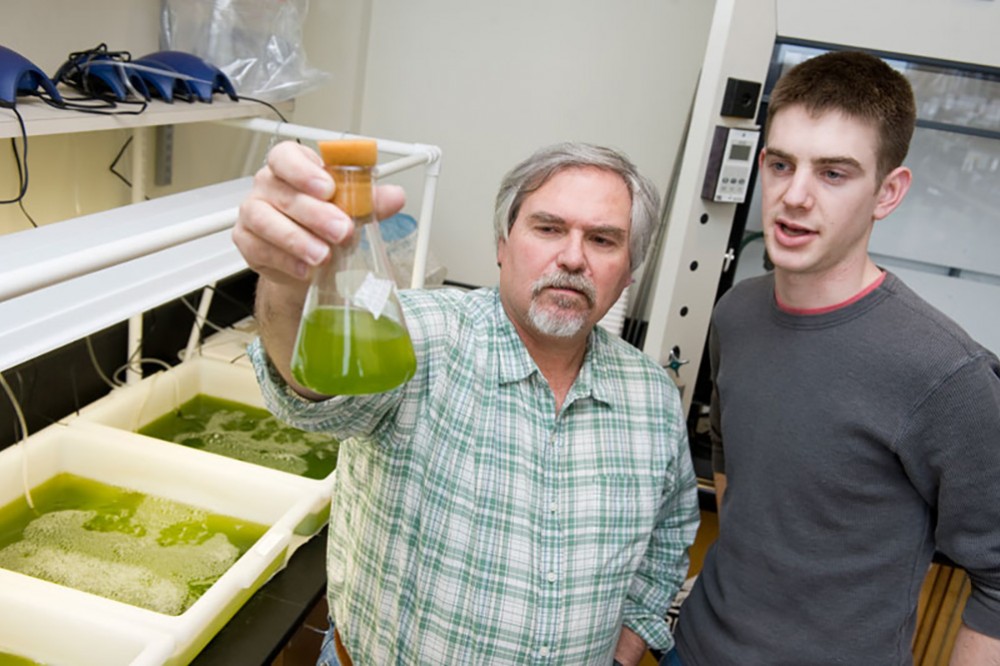 âAlgaeâas a renewable feedstockâgrow a lot quicker than crops of corn or soybeans,â says Eric Lannan, right, who is working on his masterâs degree in mechanical engineering. âItâs a more continuous source that could offset 50 percent of our total gas use for equipment that uses diesel.â Lannan and Jeff Lodge, left, associate professor of biological sciences, are developing biodiesel from microalgae grown in wastewater. Theyâve moved their research out of the lab and to Environmental Energy Technologies Inc. on Brighton-Henrietta Townline Road, where theyâve scaled up production from 30 to 100 gallons, with Lannanâs thesis advisor Ali Ogut, professor of mechanical engineering and president and CTO of EET. -