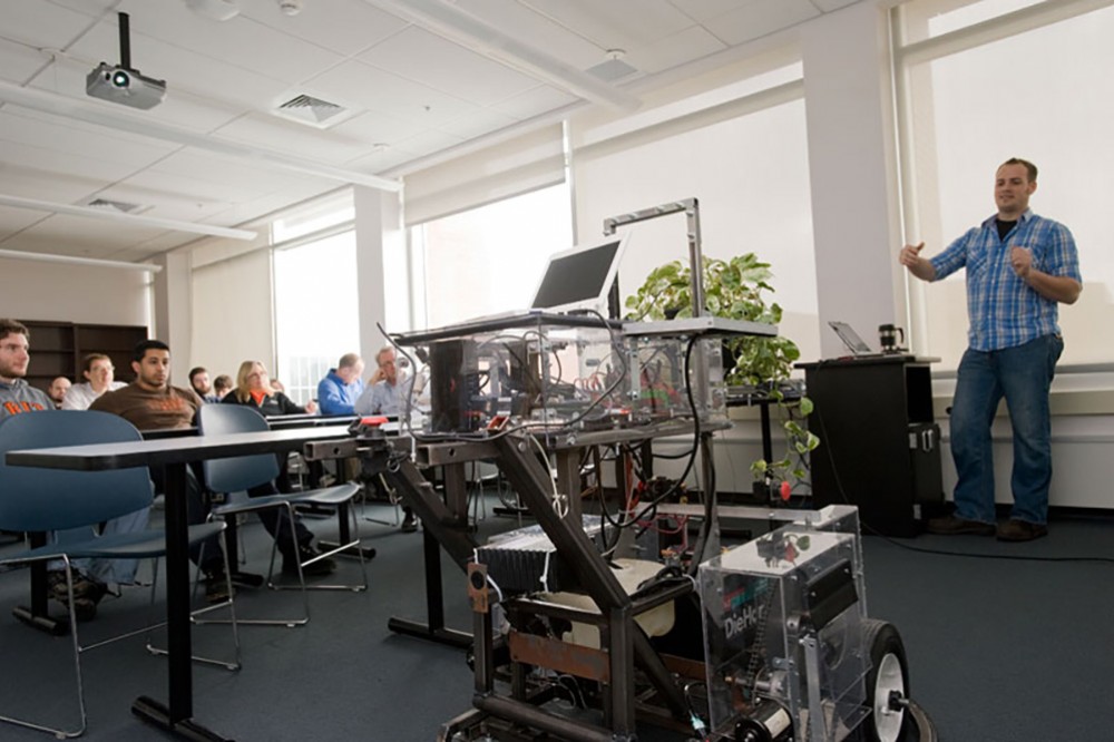 Upgrading and improving the âWandering Campus Ambassadorâ took the collective expertise of students from mechanical, electrical and computer engineering as well as peers from industrial design. The robotic system and its intricate mechanical elements were on display at the multidisciplinary senior design presentations in the Kate Gleason College of Engineering on Feb. 18. The device is designed to move around campus to not only generate interest in robotics but to raise awareness about self-sustaining energy platforms. The project, sponsored by the RIT Provostâs Learning Innovations Grant, focused on upgraded solar collectors and improved mechanical components. -