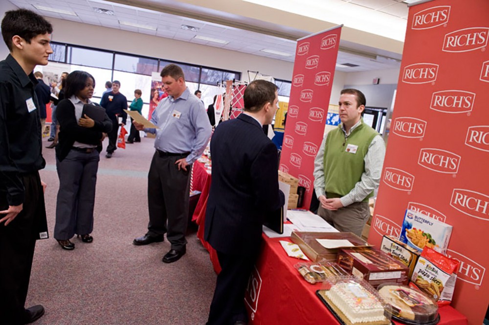 The annual Packaging Science Career Fair took place on Feb. 2. Several company representatives are RIT alumni including two from Rich Products Corporation. Brian Rudyk, left, and Brooks Davidson, right, are packaging science graduates. -