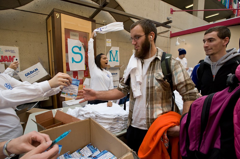 Students mob the Student Union to pick up free T-shirts, pens and gumballs to prepare for Freeze Fest Feb. 4-6. -