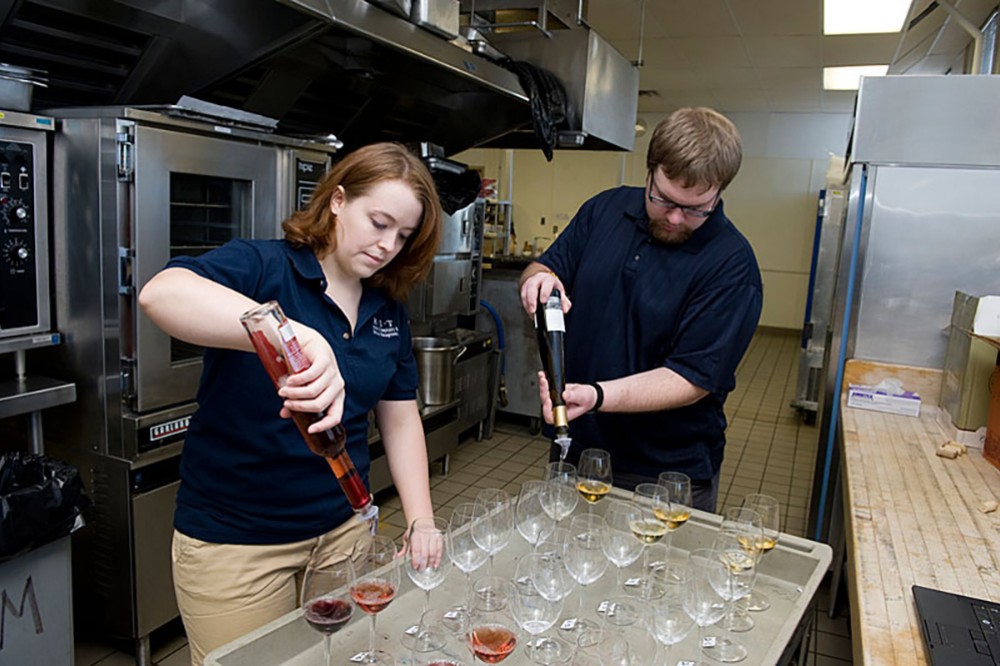 Judging for the second annual New York Ice Wine Competition took place Jan. 14 at Henryâs restaurant. Here, Abby Holland, a fourth-year food management major, and Tom Small, a fourth-year criminal justice major, prepare for the event, which was coordinated by Lorraine Hems, lecturer, and students in the School of International Hospitality and Service Innovation in RITâs College of Applied Science and Technology. The New York Ice Wine Festival is Feb. 5 at Casa Larga Vineyard. -