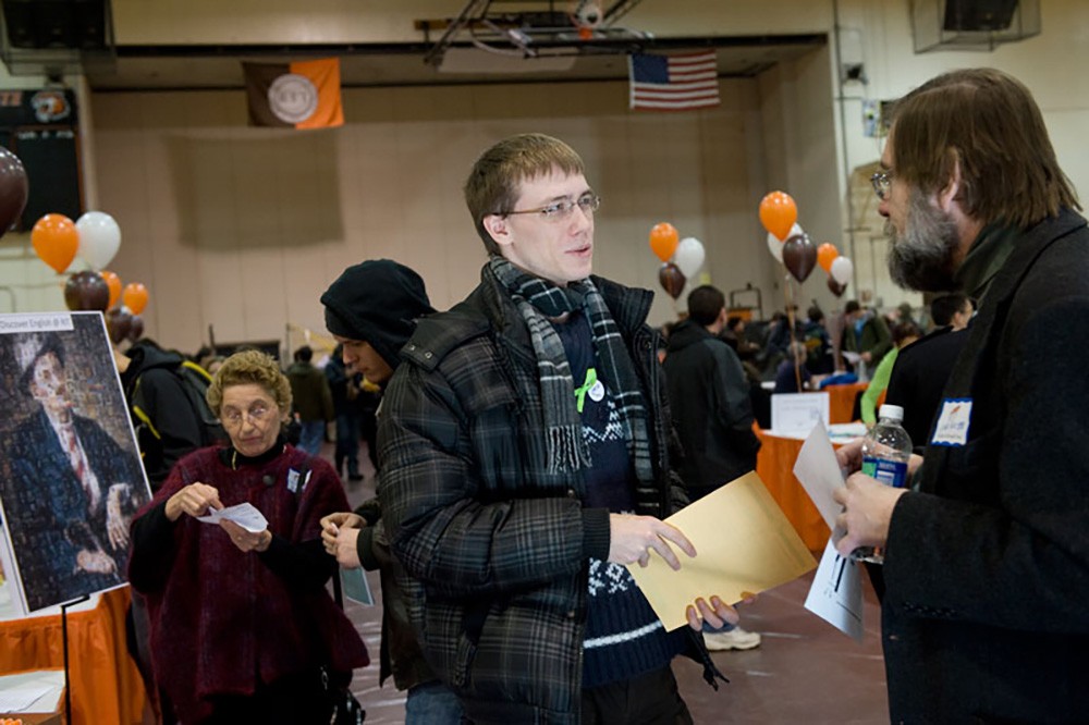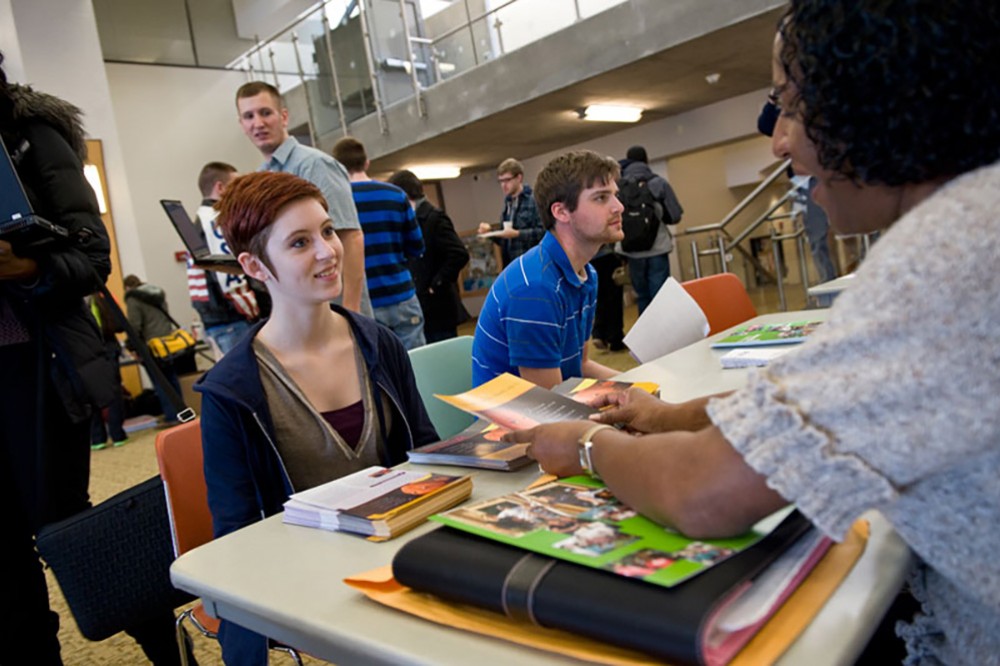 The Liberal Arts Minor and Concentration Fair on Jan. 21 featured faculty representatives from the more than 40 minors and concentrations offered through the College of Liberal Arts. John Roche, right, associate professor of English, answers questions from Jan Dvorak, a first-year student in the Golisano College of Computing and Information Sciences. -