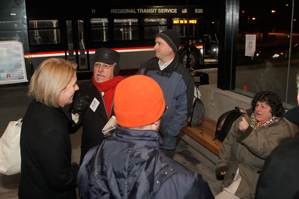 Twenty RIT decision makers spent three days and two nights at the RIT Inn & Conference Center, Global Village and Perkins Green apartments for The REAL RIT Challenge, sponsored by Student Government. The challenge was to master campus transportationâlearning how to read shuttle bus schedules to arrive on campus on time, and to get to off-campus locations such as Wegmans, Park Point and Dinosaur Bar-B-Que. Here, a group waits to board a bus to take them to their assigned destination on Jan. 20. -