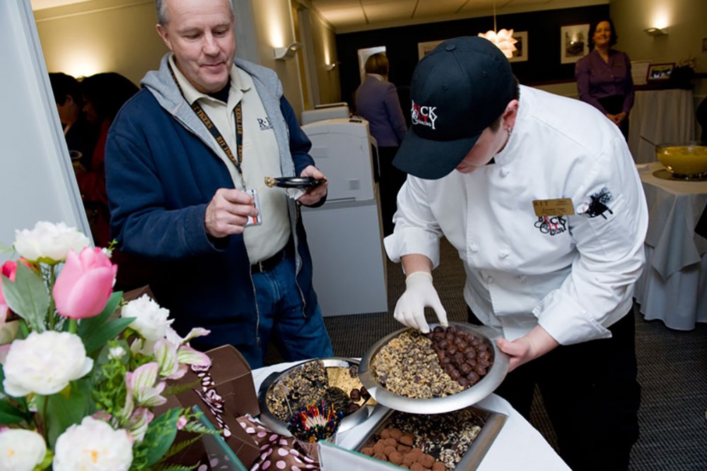 Gerard DeLone, a chocolate lover from Facilities and Management Services, sampled a variety of homemade truffles at the Brick City Catering open house on Jan. 21. Customers ordering Valentineâs Day truffles will be entered into a drawing to win a free truffle-making class with chef Autumn Geer, on right. -