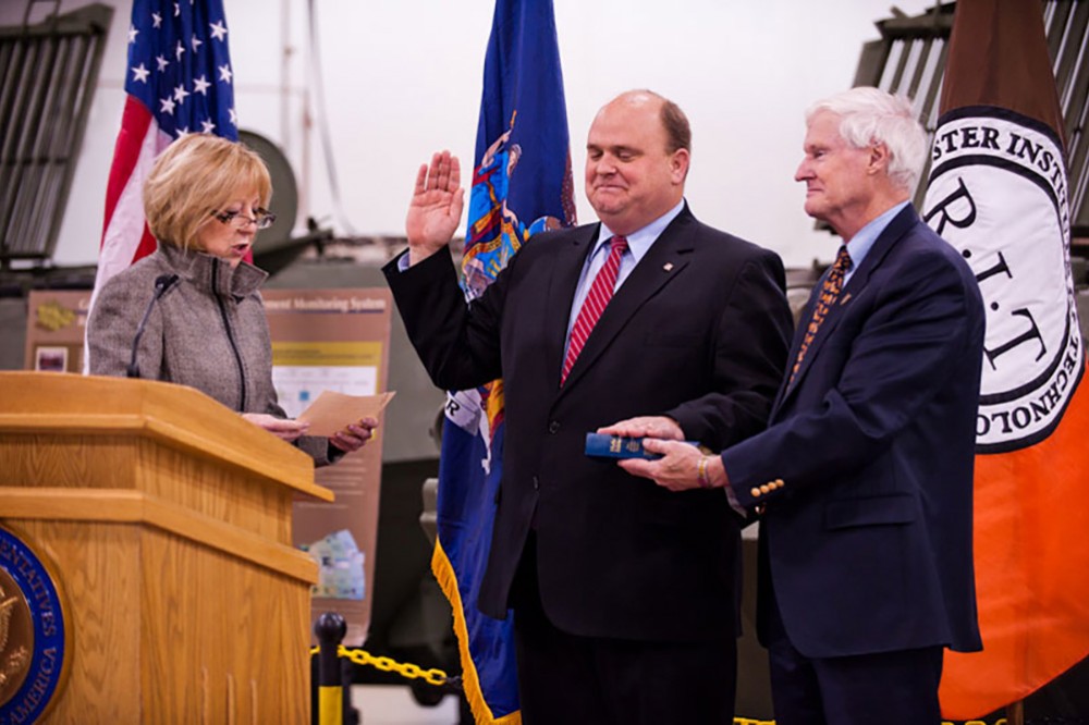 Newly elected U.S. Congressman Thomas Reed, center, is sworn into office by Monroe County Executive Maggie Brooks, alongside RIT President Bill Destler, at a ceremony Nov. 10 at RIT. Reed was elected Nov. 2 in a special election to represent the 29th District in New York, replacing Eric Massa. -