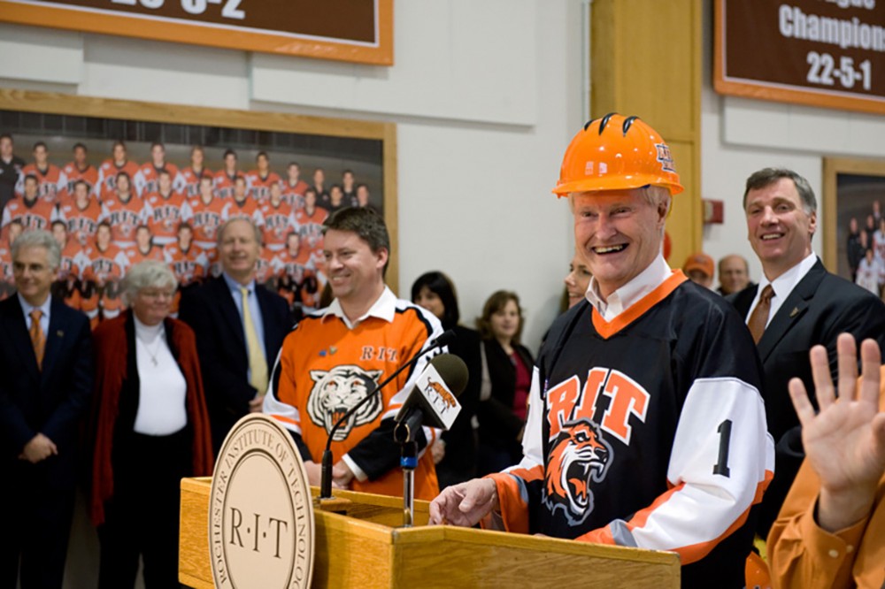 RIT officially launched Tiger Power PlayâThe Campaign for RIT Hockey at a news conference Nov. 12 in Ritter Arena. The initiative aims to raise $15 million toward construction of an arena seating up to 6,000 fans. President Bill Destler (at podium) introduced alumnus Stephen Schultz (left), co-founder and chief technical officer of Pictometry Corp., and his wife, Vicki Schultz, an RIT alumna. The couple presented the campaignâs opening gift of $1 million. Menâs hockey head coach Wayne Wilson (standing behind Destler) looks on. -