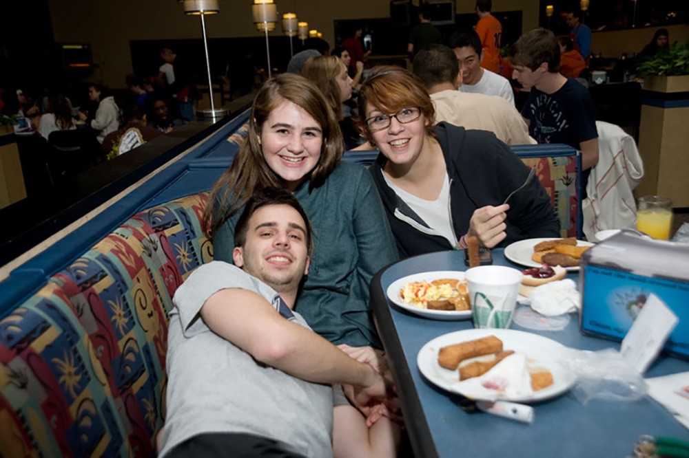 Students Brandon Mercer, Mady McKenna and Katherine Zickgraf, right, indulge in a hot, late-night meal during Midnight Breakfast Nov. 12. The annual event, hosted by the Center for Residence Life, helps students ease the stress of end-of-quarter finals by being served breakfast by faculty and staff members. -