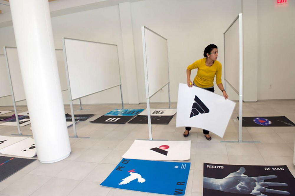 An official dedication ceremony for the Vignelli Center for Design Studies will be held at 3 p.m. Sept. 16 with the Vignellis in attendance. Also in attendance will be renowned Italian graphic designer Armando Milani. Here, Tanvi Asher, a 2010 graduate of RITâs Industrial Design program, works on Milani's exhibit of 50 posters and 50 logotypes being hung in the new gallery space. -