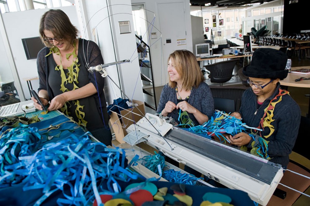 Xanthe Matychak, Andrea Handy and Michelle Harris will be bringing their project, “River Memoir,” to the Maker Faire in New York City on Sept. 25. The three are knitting a long blue scarf that symbolizes a river. Visitors to their exhibit will be able to weave their own personal six-word memoirs into the river. -