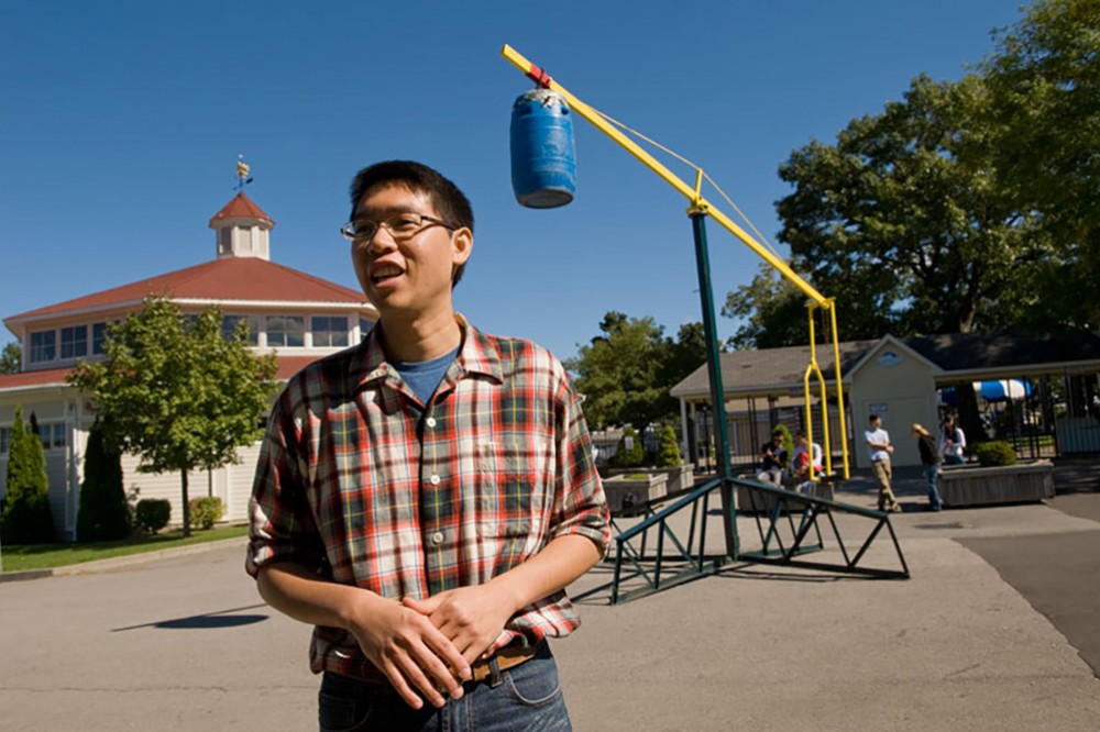 Ming Hsuan Chiang, a graduate student in RIT’s industrial design program, has built an 18-foot long rotatable seesaw for his thesis project. Chiang has been working for the past two months with Dean Shorey, an engineer at Seabreeze Amusement Park, to construct it. -