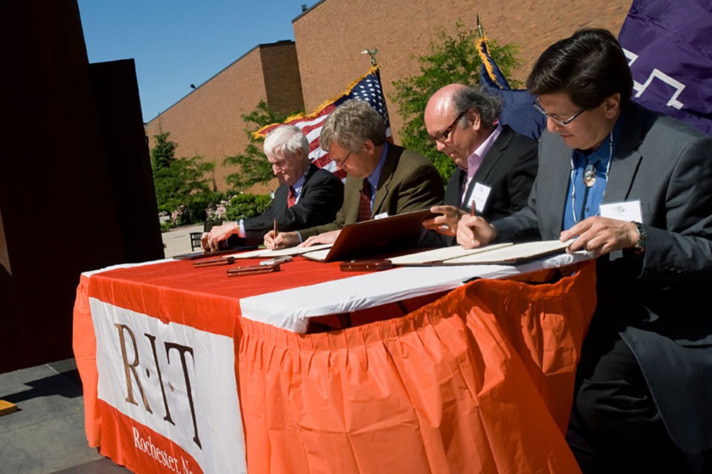 RIT signed a memorandum of understanding with the Ganondagan State Historic Site to coordinate and expand research and education projects related to the history and culture of the Five Nations Iroquois on June 7. The partnership will also work to enhance development of the Center for Native Science and Technology at Ganondagan.