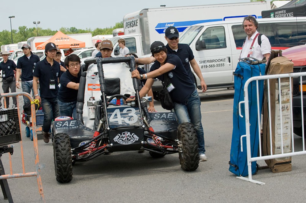 RIT is hosting the Baja SAE Rochester World Challenge June 11-13 at RIT’s Gordon Field House and at Hogback MX in Palmyra, Wayne County. Here, the team from Keimyung University, South Korea, rolls their car to the inspection stations.