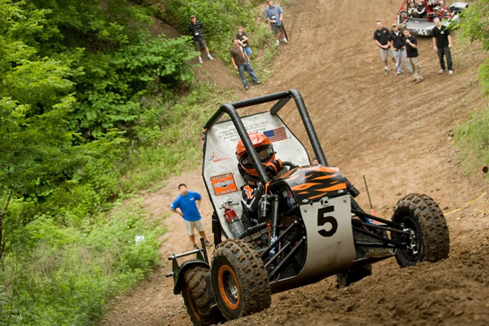 Drivers from 89 of the best Baja teams from the United States, Canada, South Korea, India, France and Venezuela got wet and muddy, climbed hills, raced through the water obstacle and endured some of the roughest terrain in the 2010 Baja SAE Rochester World Challenge June 11-13. At the end of the three-day competition, Cornell University took home the championship trophy winning the overall title. The second place team was the University of Windsor (Canada). RIT, host of the event, entered two cars and both placed in the top 10 overall, with the #5 car taking third place and the #83 car taking tenth. In individual events throughout the weekend, the RIT #5 team placed second in the design report category and took third in the endurance event. Teammates in the #83 car took first place in the grueling endurance event on Sunday. Here, RIT’s car completes the hill climb.