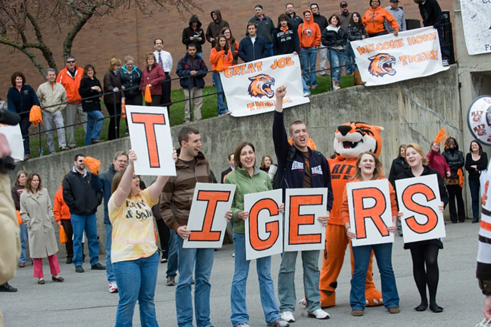 Waving orange pompoms and carrying signs, hundreds of RIT hockey fans welcomed home their tenacious Tigers during a Friday afternoon on-campus rally. The RIT Menâs Hockey team made its first-ever debut in the NCAA Division I Frozen Four in Detroit April 8. RIT lost 8-1 to the Wisconsin Badgers. It was a storybook season for the Tigers who set several school records, including most wins (28), longest winning streak (12) and fewest goals allowed per game (2.18).
