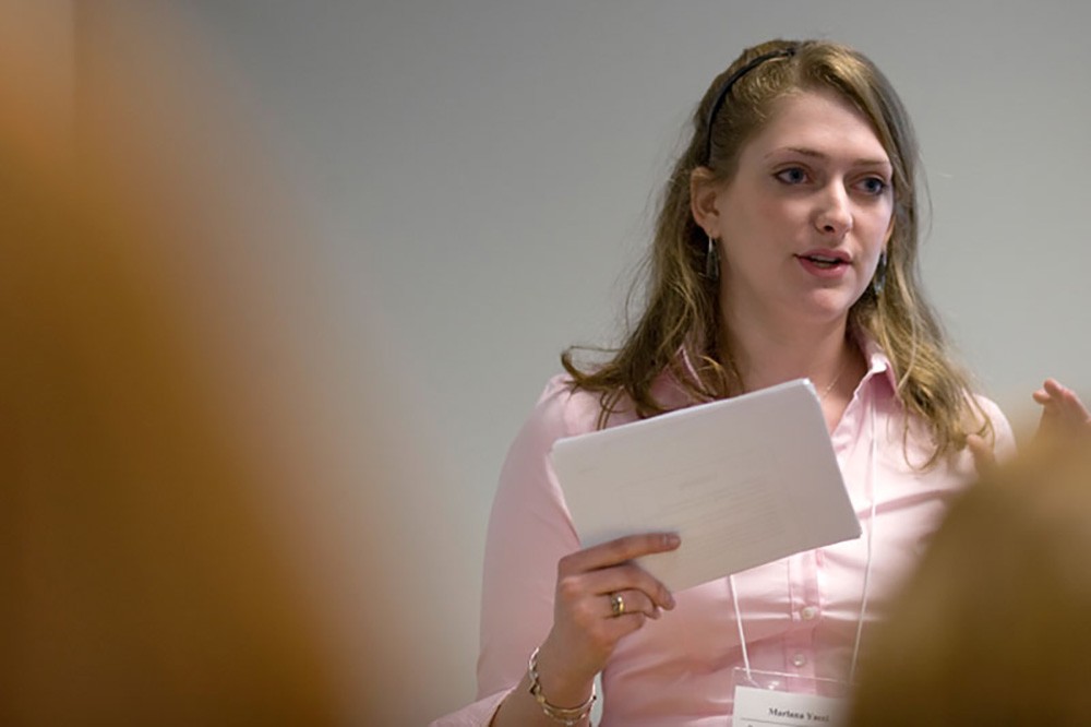 Undergraduate students from universities across the country presented their research projects in public relations, advertising, new media and journalism at RITâs 2010 Conference for Undergraduate Research in Communication April 14. The annual event is sponsored by the Department of Communication. Here, RIT fourth-year student Marlana Yacci discussed her study Credibility and Opinion Leadership and their Effects on Facebook Marketing Communications. -