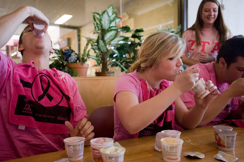 Zeta Tau Alpha hosted a yogurt eating contest to support breast cancer education on April 20. 30 participants gobbled several containers of yogurt in a timed session. Three winners received gift cards and everyone got a pink towel to clean up with. -