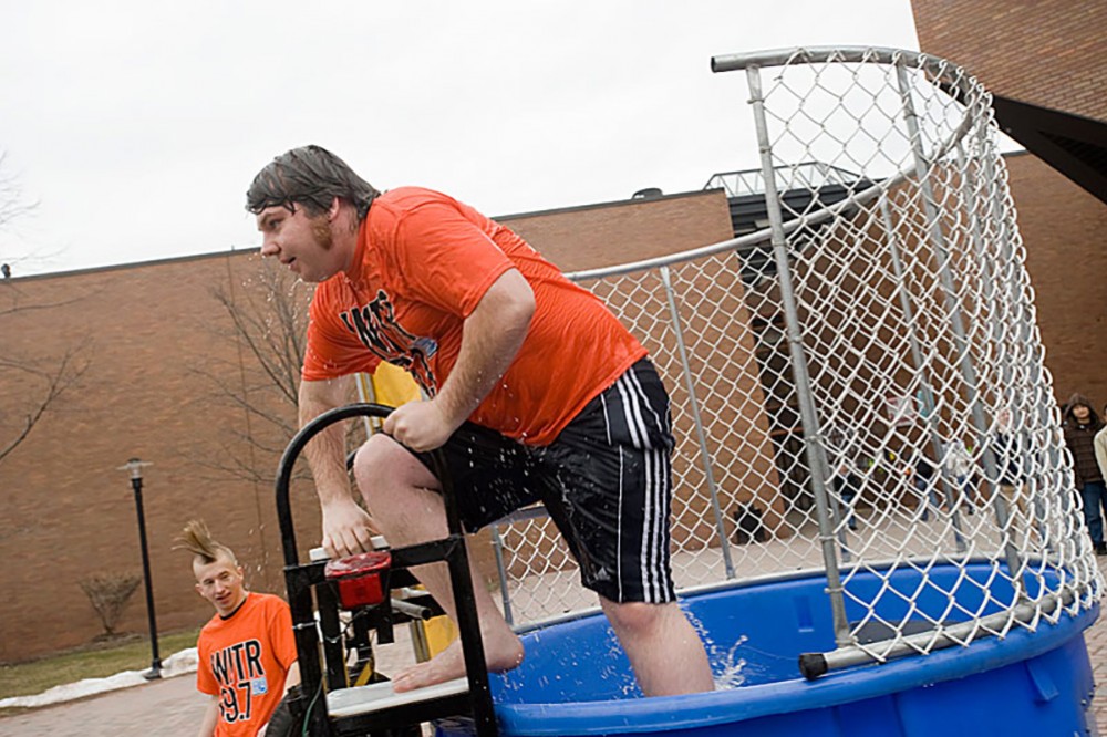 Mike Good, a second-year networking, security and systems administration major and WITR-FM (89.7) staff member, emerges from a dunking booth set up on RITâs Quarter Mile March 12 to help celebrate the stationâs new sloganââWITR 89.7 The Pulse of Musicââand logo. Visitors to the âDunk a DJâ event received WITR T-shirts and other station prizes. The student-run radio station also unveiled a new Web site. Taylor Osmonson, a second-year mechanical engineering technology major and WITR promotions director, looks on.