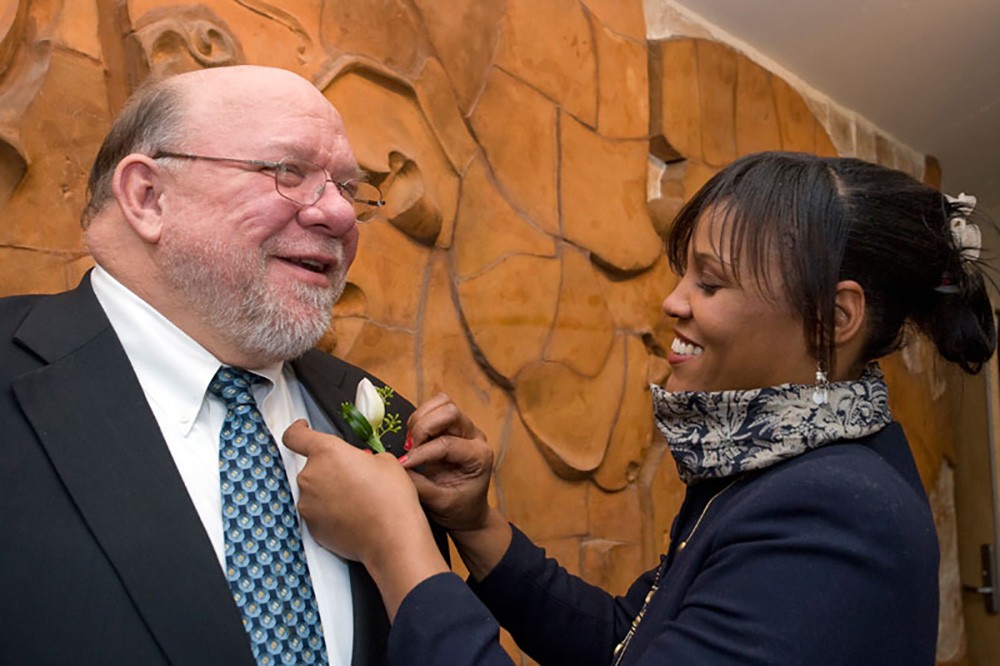Criminal Justice professor Lavern McQuiller Williams fixes the boutonniere for Four Presidents Distinguished Public Service Award winner John Klofas before the award ceremony March 16. Klofas, chair of the criminal justice department, was honored with RITâs highest public service award for his three decades of community work in the areas of crime reduction and community development. -