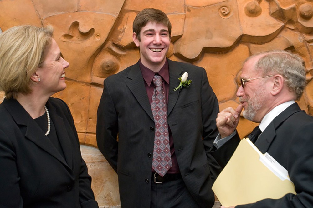 Mary Beth Cooper, vice president of student affairs and James DeCaro, a member of the selection committee, congratulate third-year biomedical sciences major Ryan Buckley, center, who was honored with the 2010 Bruce R. James â64 Distinguished Service Award during a ceremony March 16. Buckley was selected for his commitment to community development and service both in Rochester and around the world. He spent last summer in Kenya volunteering as a health care worker for Kikuyu Hospital, in the city of Kikuyu. -