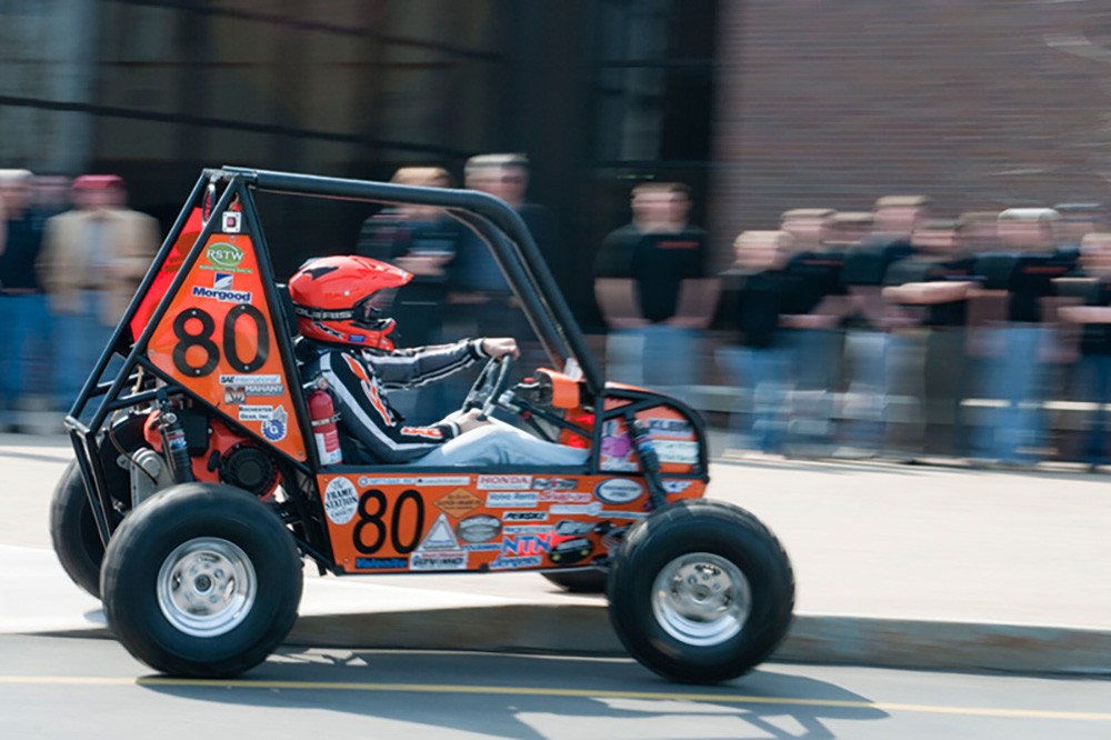 The RIT Baja team unveiled its 2010 off-road vehicle on March 20. RIT driver Mike Hargrave zipped around in front of the Louise M. Slaughter Building to demonstrate the carâs agility. RITâs team will host nearly 90 other teams at the Baja SAE Rochester Wet World Challenge June 11â13. -