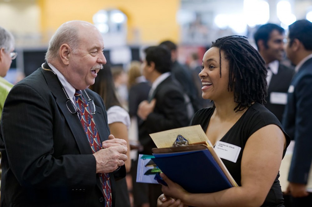 Debora De Jesus Ryan, business management, talks with a representative from Colonial Life at RITâs Spring Career Fair on March 24. Representatives from 151 companies gathered in the Gordon Field House and Activities Center to meet with students and alumni. 1,300 attendees arrived in the first hour alone. -