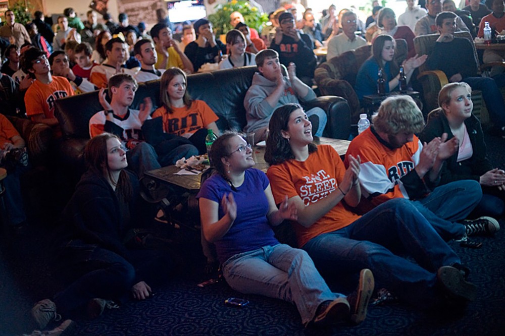 RIT hockey fans filled the RITz March 26 to watch the Tigers play University of Denver in the NCAA Tournament in Albany. The team celebrated a 2-1 win and will play again on Saturday. The winner of that game advances to the NCAA Frozen Four April 8â10 in Detroit. -