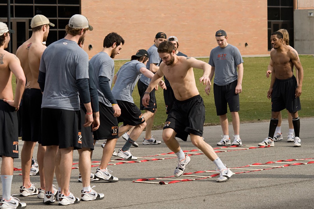 The RIT hockey team gathered recently for agility training outside the Frank Ritter Arena. The Tigers are preparing for the first semifinal of the 2010 NCAA Menâs Frozen Four, versus the Wisconsin Badgers, at 5 p.m. April 8 in Ford Field in Detroit. -