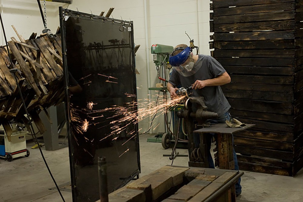 A student in the School for American Crafts grinds a tool in the forge room, one of the new renovated spaces in the school. -