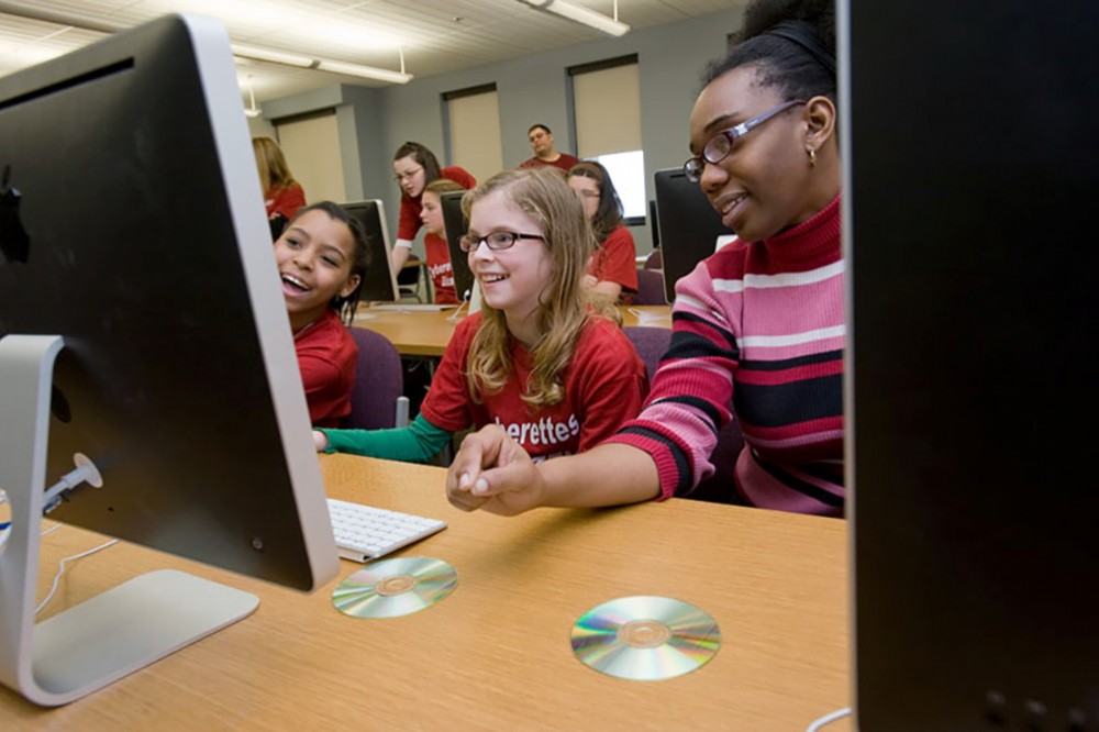 The Cyberettes, a computer club made up of girls from the Fairport middle schools, visited RITâs B. Thomas Golisano College of Computing and Information Sciences Jan. 29. The visit was sponsored by the Women in Computing organization, which worked with The Cyberettes to film and edit 30-second videos using the iMovie software. -