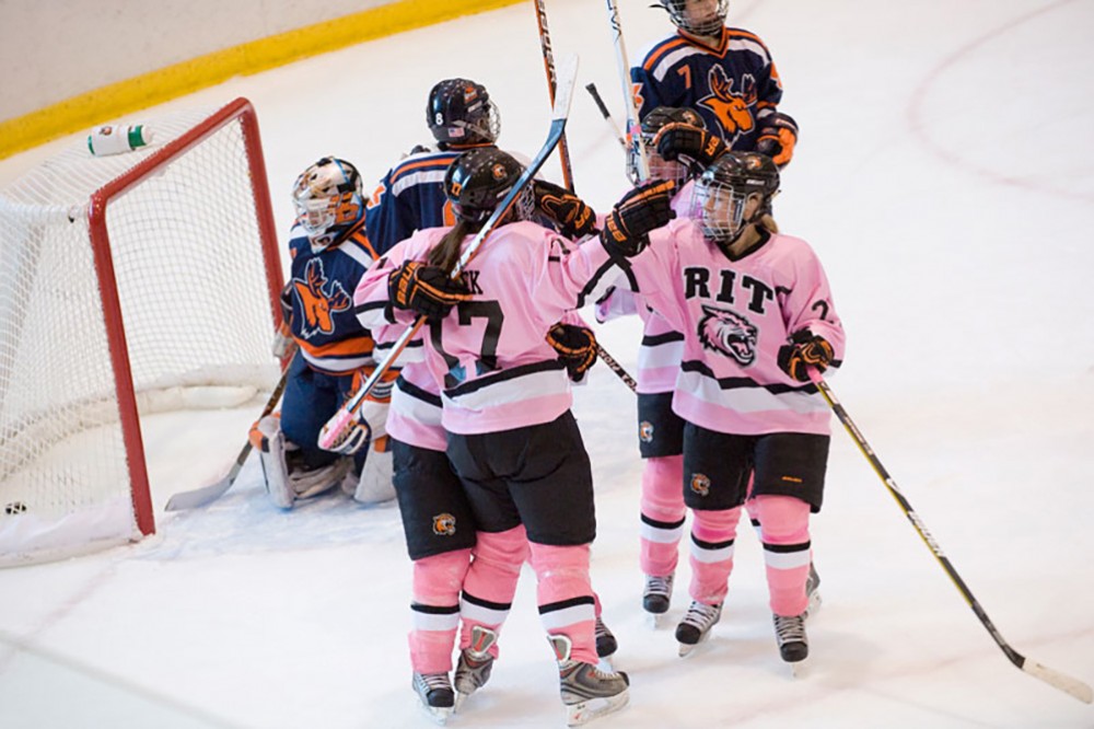 RIT womenâs hockey celebrated âMake the Rink Pinkâ Jan. 30 with a 5-3 win over Utica. The event was a collaboration with Zeta Tau Alpha sorority to raise money for cancer research by selling pink T-shirts and auctioning the playersâ pink jerseys. Proceeds will go to the Lipson Cancer Center and Susan G. Komen Cancer Foundation. -