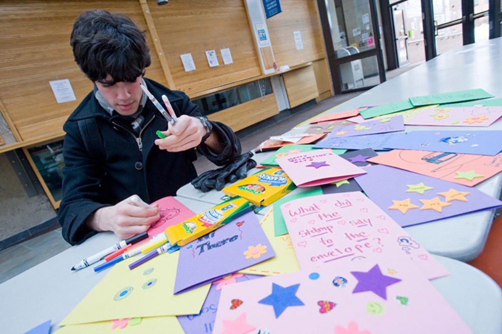 As part of a community service project, First-Year Enrichment students enrolled in the University Studies Program set up a table in the Student Alumni Union to decorate valentines. Students, faculty and staff could sign and decorate the cards for children at the Golisano Childrenâs Hospital. Here, Jonathan Peartree, a first-year student in the College of Imaging Arts and Sciences, puts finishing touches on his card. -
