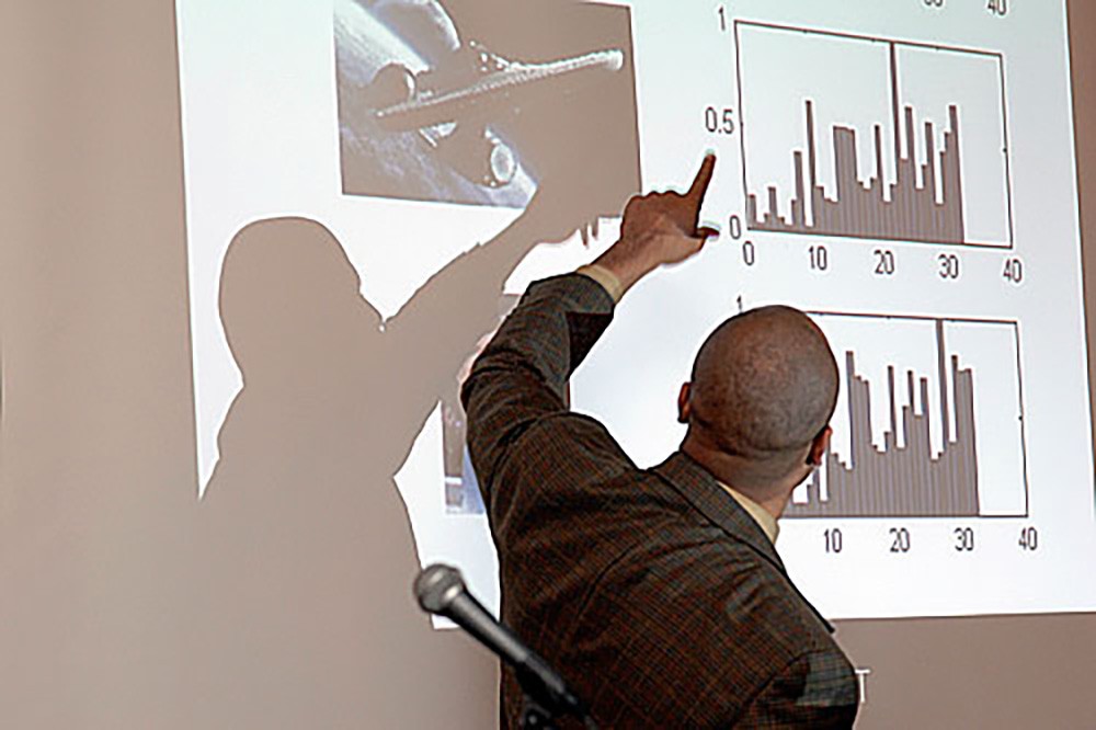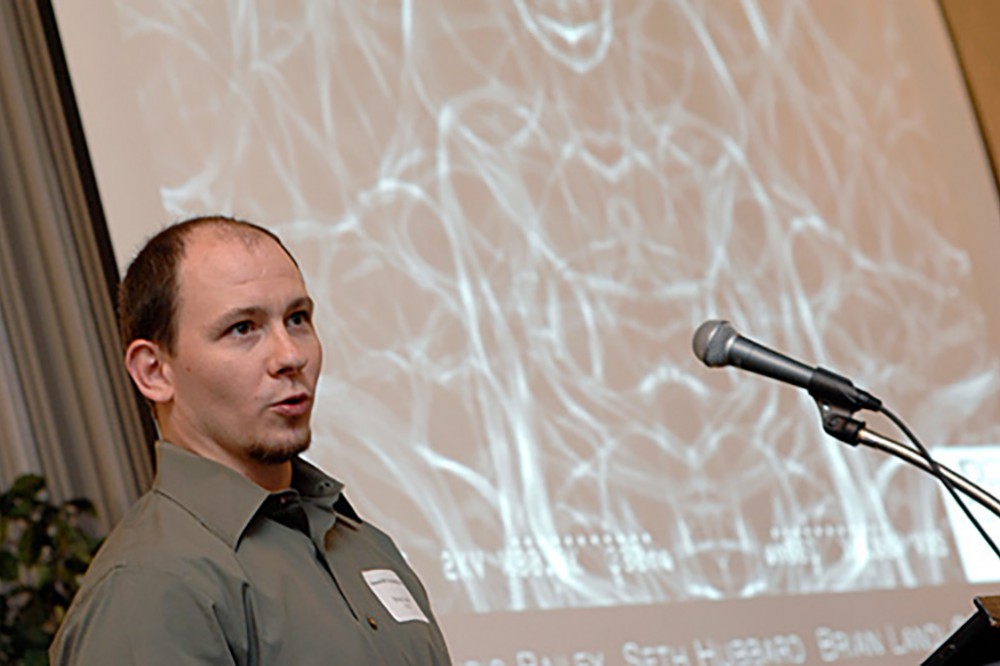 The RIT Imaging Bash brought together faculty and staff members to share their imaging-related research on June 2. Everyone had two minutes with their image displayed to state their name, something about themselves and a summary of the research or creative aspect of their work. Here, Chance Glenn, from the College of Applied Science and Technology, explained his research.