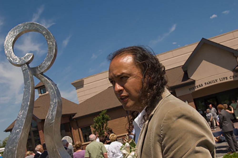 A 15-foot metal sculpture created by Juan Carlos Caballero-Perez, associate professor in RITâs School for American Crafts, was unveiled at the Pieters Family Life Center in Henrietta on June 24. Commissioned by Heritage Christian Services, Caballero-Perez designed Stronger Together, a silver-toned abstract piece comprised of two curved columns connected at the top by a circular piece. -