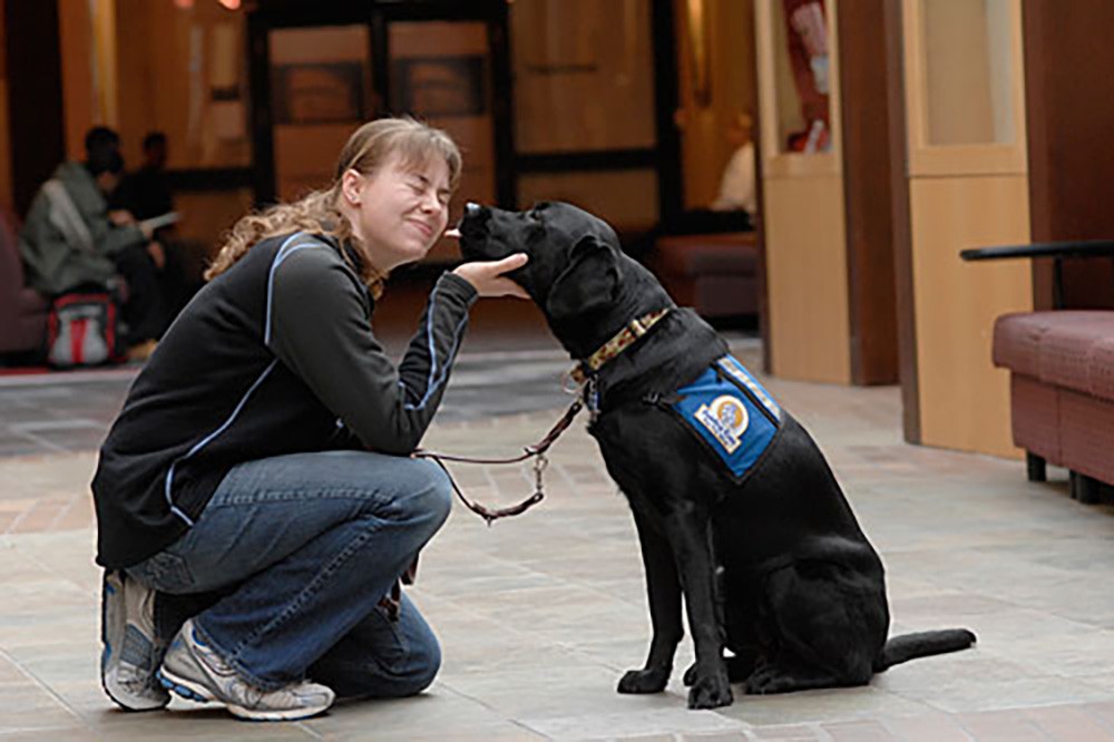 Betsy Khol, a first-year industrial engineering major, with Buster, a service dog in training. Khol is training Buster for part of the year at RIT. -