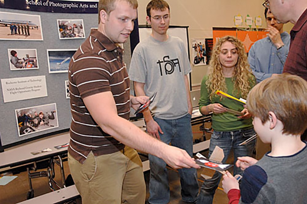Students from RITâs imaging and photographic technology program talked to elementary students and their parents at Leary Elementary Schoolâs Social Studies and Science Fair about their upcoming flight aboard NASAâs Vomit Comet. The student team will test the feasibility of inkjet printing in zero-gravity. -
