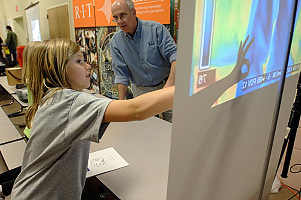 Students attending the Leary Elementary Schoolâs Social Studies and Science Fair last week learned how to interpret colors seen in a thermal range. Joe Pow, associate director of the Chester F. Carlson Center for Imaging Science, explained the science behind it. -